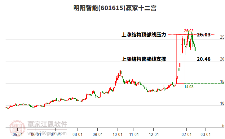 依據(jù)贏家江恩系統(tǒng)趨勢工具極反通道分析判斷明陽智能601615運行在生命線以下弱勢區(qū)域,根據(jù)規(guī)則該股短線輕倉參與,股價跌至弱勢外軌線后波段再結合其它工具信號建倉。應用口訣是:生命線上強勢走,生命線下難抬頭;紅黃兩條外軌線,壓力支撐顯勢頭。