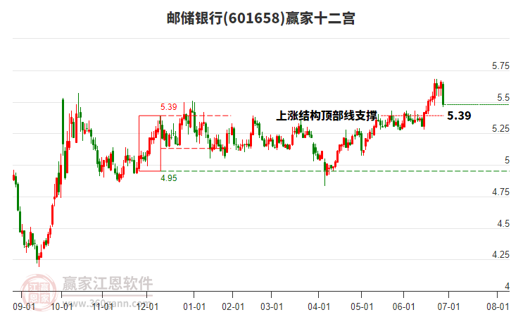 601658郵儲(chǔ)銀行根據(jù)贏家江恩極反通道趨勢(shì)工具展示,上方壓力位5.8269,下方支撐位5.1451。601658郵儲(chǔ)銀行處于贏家江恩多頭中期回調(diào)形態(tài),從11月20日形成頂分型后持續(xù)下跌,重心下移,今