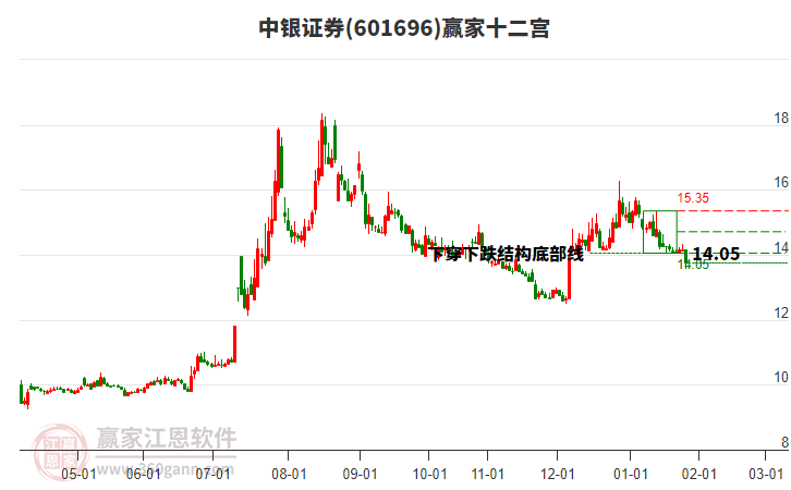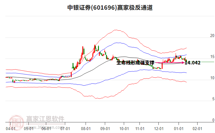 依據(jù)贏家江恩系統(tǒng)趨勢工具極反通道分析判斷中銀證券601696運行在生命線以下弱勢區(qū)域,根據(jù)規(guī)則該股短線輕倉參與,股價跌至弱勢外軌線后波段再結(jié)合其它工具信號建倉。應(yīng)用口訣是:生命線上強勢走,生命線下難抬頭;紅黃兩條外軌線,壓力支撐顯勢頭。