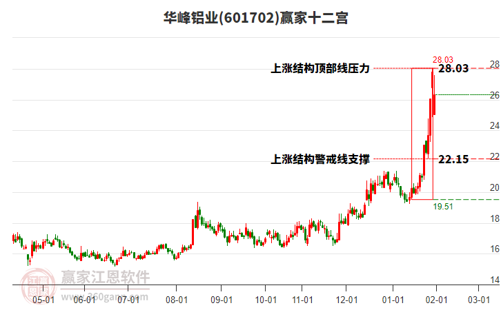 華峰鋁業(yè)(601702)處于贏家江恩多頭主線形態(tài),從1月14日形成底分型后持續(xù)上攻,今日突破前高形成初次江恩筑底信號(hào),中長(zhǎng)期多頭趨勢(shì)依舊保持。華峰鋁業(yè)截至目前K線為穿頭破腳大陽(yáng)線,雖然這種K線通常代表