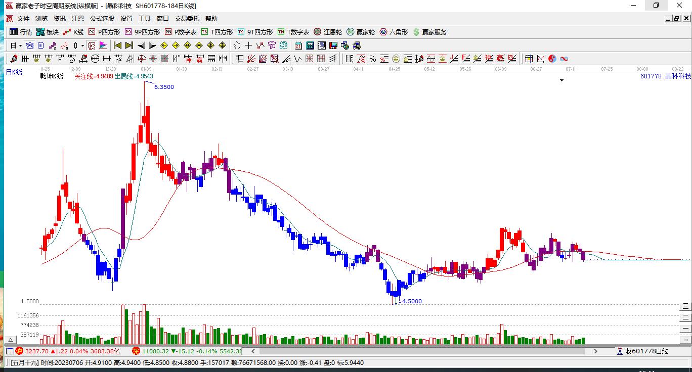 晶科科技(601778)處于贏家江恩多頭中期回調(diào)形態(tài),今日重心上移,形成底分型,6月16日發(fā)出中期江恩筑底信號后,經(jīng)過203日,今日形成中期筑頂信號,若持續(xù)下跌,觸發(fā)長期筑頂信號,晶科科技(60177