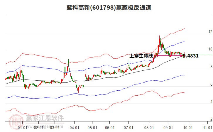 依據(jù)贏家江恩系統(tǒng)趨勢工具極反通道分析判斷藍(lán)科高新601798運(yùn)行在生命線以下弱勢區(qū)域,根據(jù)規(guī)則該股短線輕倉參與,股價(jià)跌至弱勢外軌線后波段再結(jié)合其它工具信號建倉。應(yīng)用口訣是:生命線上強(qiáng)勢走,生命線下難抬頭;紅黃兩條外軌線,壓力支撐顯勢頭。