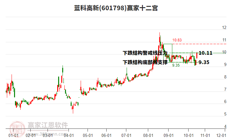 藍(lán)科高新處于贏家江恩多頭中期回調(diào)形態(tài),12月16日發(fā)出江恩筑頂信號后,經(jīng)過20日,今日再次發(fā)出江恩底分型并發(fā)出江恩筑底信號,中長線均在空頭下跌趨勢中。藍(lán)科高新根據(jù)贏家江恩極反通道趨勢工具展示,上方壓力