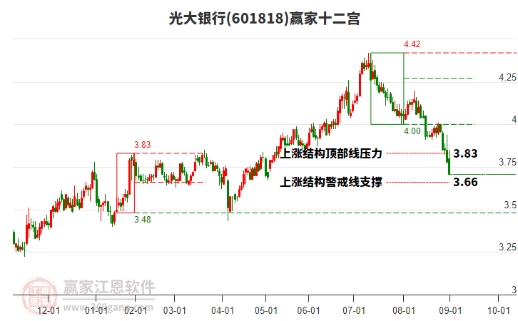 光大銀行處于贏家江恩多頭主線形態(tài),9月25日發(fā)出中期江恩筑頂信號(hào)后,經(jīng)過95日,今日中期形成江恩筑底信號(hào),屬中期多頭預(yù)警,長期處于多頭回調(diào)趨勢。光大銀行根據(jù)贏家江恩極反通道趨勢工具展示,上方壓力位3.