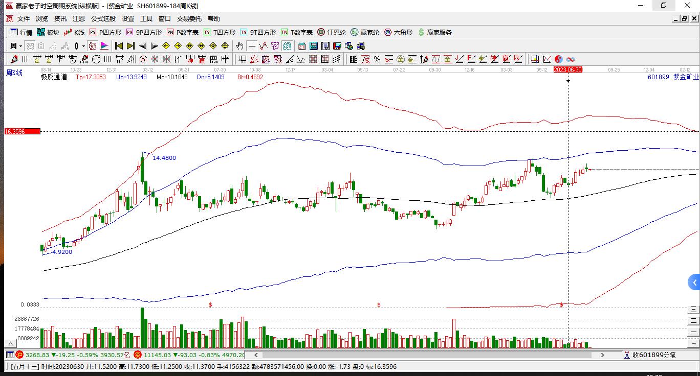 目前紫金礦業(yè)601899挑戰(zhàn)上方紅色外軌線 以下影小陽線收盤