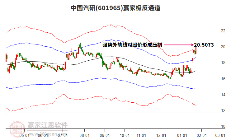 當(dāng)天中國(guó)汽研601965最高價(jià)20.18挑戰(zhàn)了贏家極反通道工具上方紅色外軌線,受到上方紅色外軌線強(qiáng)力壓制,最終收盤停留在在上方紅色外軌線與藍(lán)色外軌線上方的超強(qiáng)通道區(qū)域。中國(guó)汽研601965近10個(gè)交易