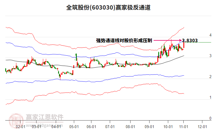 依據(jù)贏家江恩系統(tǒng)趨勢(shì)工具極反通道分析判斷全筑股份603030運(yùn)行在生命線以下弱勢(shì)區(qū)域,根據(jù)規(guī)則該股短線輕倉參與,股價(jià)跌至弱勢(shì)外軌線后波段再結(jié)合其它工具信號(hào)建倉。應(yīng)用口訣是:生命線上強(qiáng)勢(shì)走,生命線下難抬頭;紅黃兩條外軌線,壓力支撐顯勢(shì)頭。
