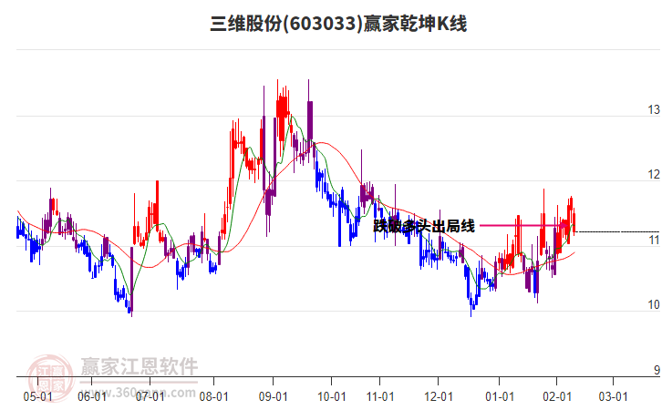 2月13日股價以小陰線收盤,近期跌破多頭出局線后持續(xù)下跌,當(dāng)前到達(dá)關(guān)注線附近,同時由紅色區(qū)域進(jìn)入紫色區(qū)域(多空爭奪期),依據(jù)贏家江恩乾坤K線多空模型,如關(guān)注線能形成有效支撐,有望再度展開上攻,波段延續(xù)上漲趨勢;如跌破關(guān)注線,由紫色區(qū)域進(jìn)入藍(lán)色區(qū)域,則預(yù)示著波段走弱,空間將會進(jìn)一步下探。