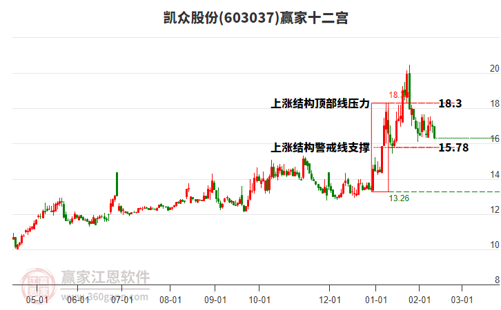 凱眾股份603037低開(kāi)收上影大陽(yáng)線(xiàn),處于乾坤K線(xiàn)紅色上漲趨勢(shì)