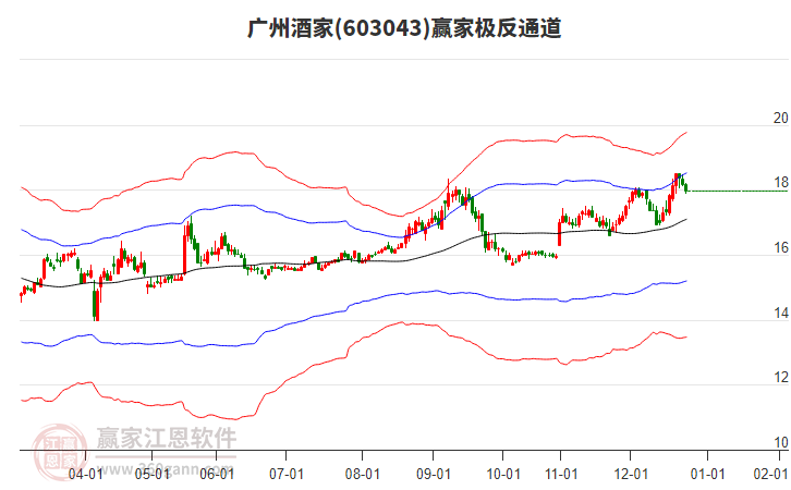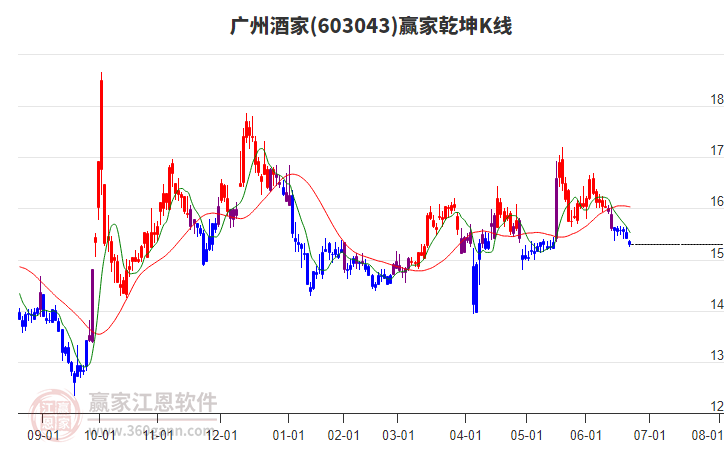 依據(jù)贏家江恩系統(tǒng)趨勢(shì)工具極反通道分析判斷廣州酒家603043運(yùn)行在生命線以下弱勢(shì)區(qū)域,根據(jù)規(guī)則該股短線輕倉(cāng)參與,股價(jià)跌至弱勢(shì)外軌線后波段再結(jié)合其它工具信號(hào)建倉(cāng)。應(yīng)用口訣是:生命線上強(qiáng)勢(shì)走,生命線下難抬頭;紅黃兩條外軌線,壓力支撐顯勢(shì)頭。