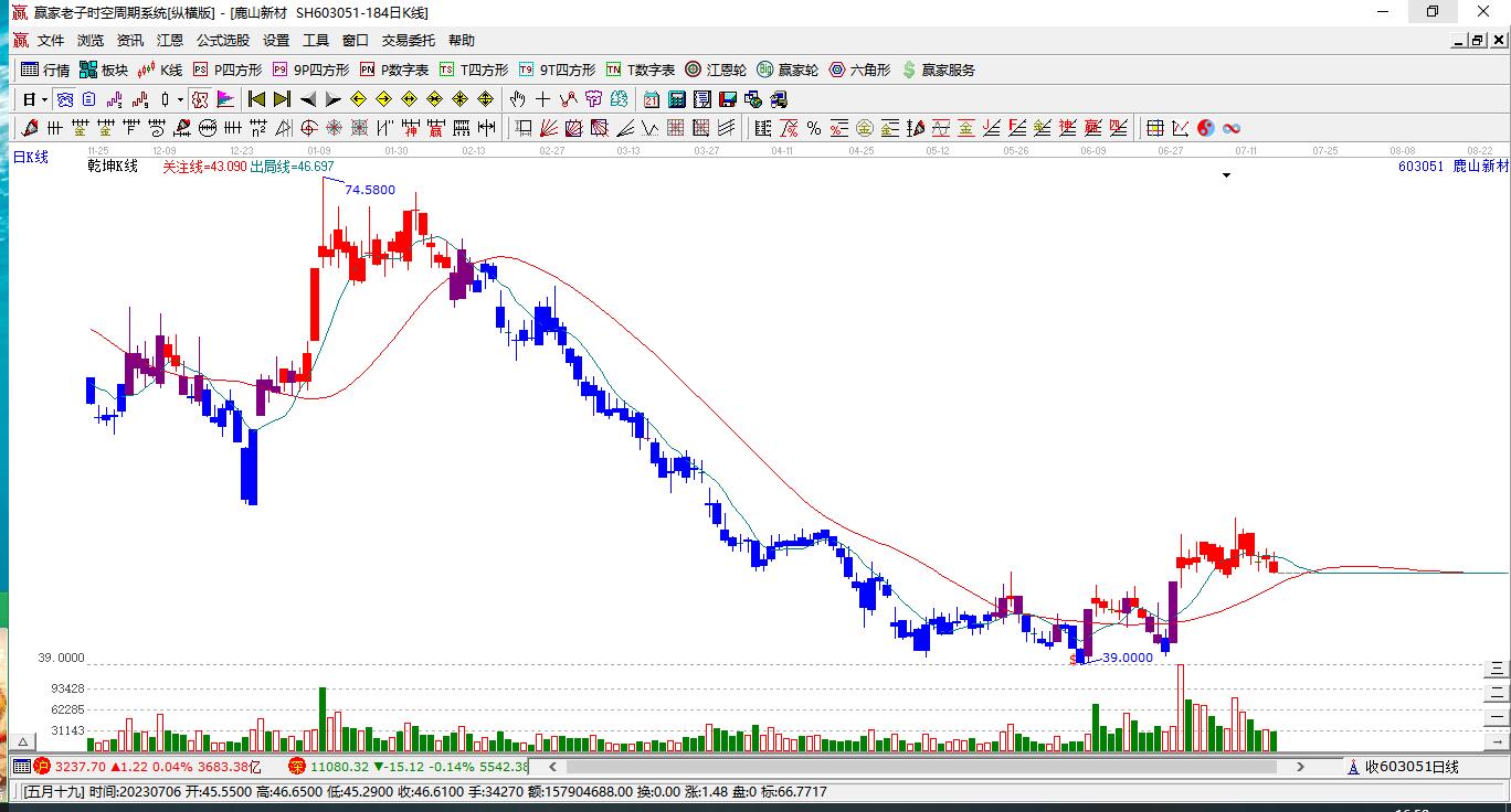 603051鹿山新材處于贏家江恩多頭次主線形態(tài),12月31日發(fā)出江恩筑底信號(hào)后,經(jīng)過(guò)42日,今日形成短期筑頂信號(hào),短期多頭趨勢(shì)已被破壞,中長(zhǎng)期多頭趨勢(shì)依舊保持。鹿山新材截至目前K線為上影陰線,此K線代