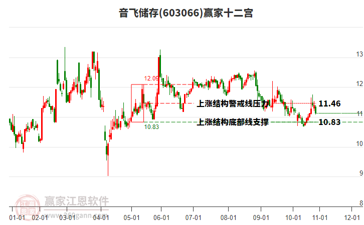 2月13日股價處在2025年5月15日形成的上漲結(jié)構(gòu)底部線與警戒線之間,今日股價微漲0.18%,目前處于底部線上方。依據(jù)贏家十二宮多空能量守恒規(guī)則,上漲結(jié)構(gòu)底部線位置是多空能量轉(zhuǎn)換的一個關鍵位置。如底部線10.83支撐不破,由多方能量主導上攻,在警戒線11.46尋找多空能量平衡。如跌破底部線,空方動能占據(jù)主導,打開新的下跌空間。