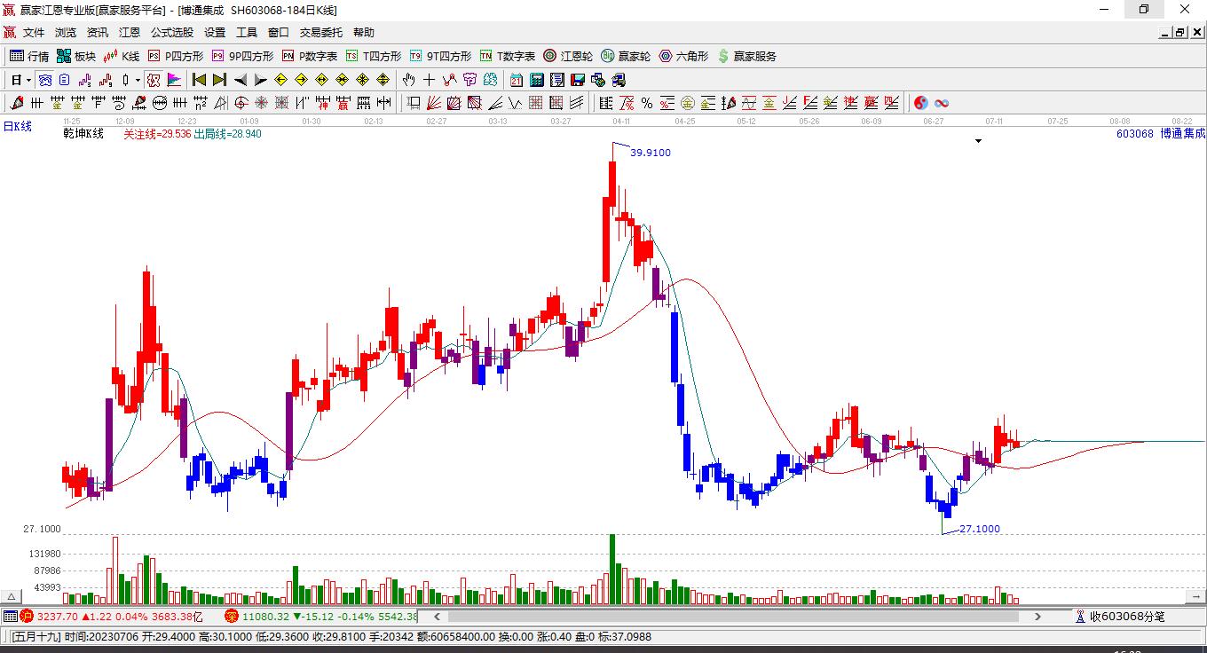 603068博通集成處于贏家江恩多頭中期回調(diào)形態(tài),1月23日發(fā)出江恩筑底信號(hào)后,經(jīng)過7日,今日形成短期筑頂信號(hào),短期多頭趨勢已被破壞,中長線均在空頭下跌趨勢中。博通集成今日跳空低開,截止目前K線呈現(xiàn)小