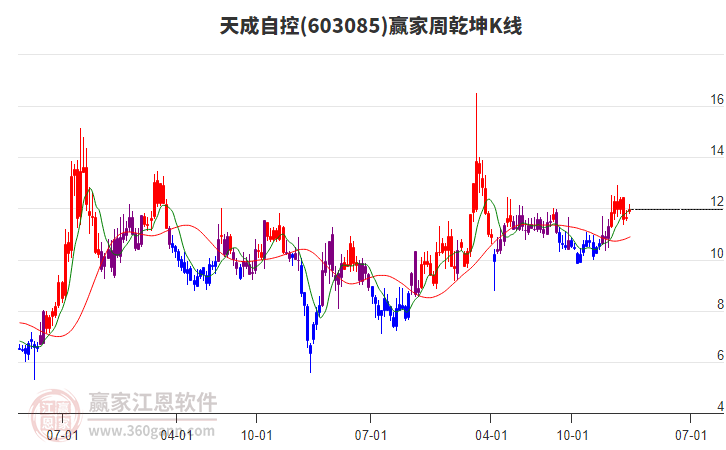 今天603085天成自控最高價(jià)11.69上穿了贏家極反通道工具藍(lán)色外軌線(xiàn),受到藍(lán)色外軌線(xiàn)強(qiáng)力壓制,最終收盤(pán)停留在在藍(lán)色外軌線(xiàn)與生命線(xiàn)上方的強(qiáng)勢(shì)通道區(qū)域。603085天成自控近10個(gè)交易日漲幅4.28%