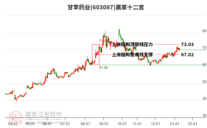 依據(jù)贏家江恩系統(tǒng)趨勢工具極反通道分析判斷甘李藥業(yè)603087運行在生命線以下弱勢區(qū)域,根據(jù)規(guī)則該股短線輕倉參與,股價跌至弱勢外軌線后波段再結(jié)合其它工具信號建倉。應(yīng)用口訣是:生命線上強勢走,生命線下難抬頭;紅黃兩條外軌線,壓力支撐顯勢頭。