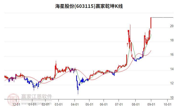 依據(jù)贏家江恩系統(tǒng)趨勢工具極反通道分析判斷海星股份603115運行在生命線以上強(qiáng)勢區(qū)域,根據(jù)規(guī)則該股可短線、波段結(jié)合操作;結(jié)合物極必反的原理通過分鐘圖做盤中差價,應(yīng)用口訣是:生命線上強(qiáng)勢走,生命線下難抬頭;紅黃兩條外軌線,壓力支撐顯勢頭。