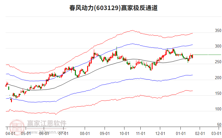當(dāng)天春風(fēng)動(dòng)力603129最高價(jià)302.55挑戰(zhàn)了贏家極反通道工具藍(lán)色外軌線,受到藍(lán)色外軌線強(qiáng)力壓制,最終收盤停留在在藍(lán)色外軌線與生命線上方的強(qiáng)勢(shì)通道區(qū)域。春風(fēng)動(dòng)力603129近10個(gè)交易日漲幅6.91