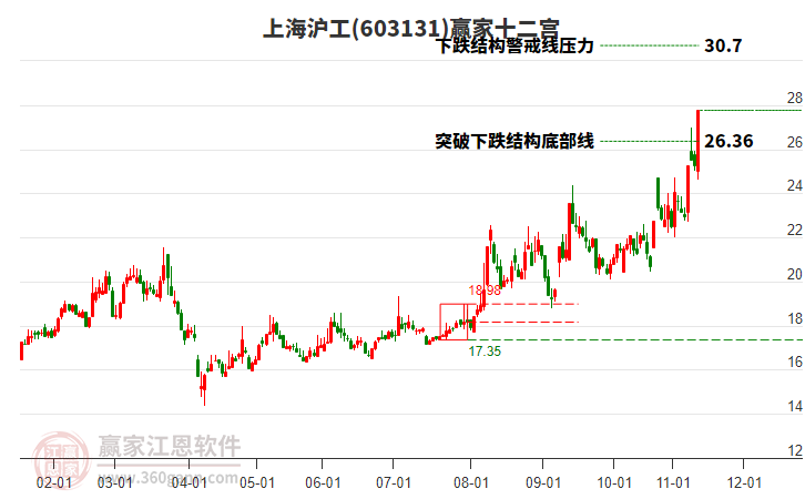 上海滬工上漲遇阻 受藍(lán)色外軌線壓制 以下影小陽線收盤