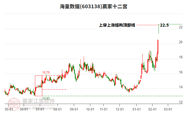 603138海量數(shù)據(jù)目前漲幅5.89%,所屬板塊華為、橫琴新區(qū)短期底分型后持續(xù)上攻。603138海量數(shù)據(jù)截止目前突破黃金價格延伸線工具壓力位19.35元,根據(jù)贏家江恩黃金價格延伸線工具展示,上方第一壓