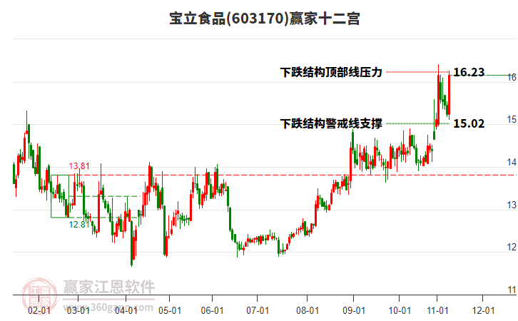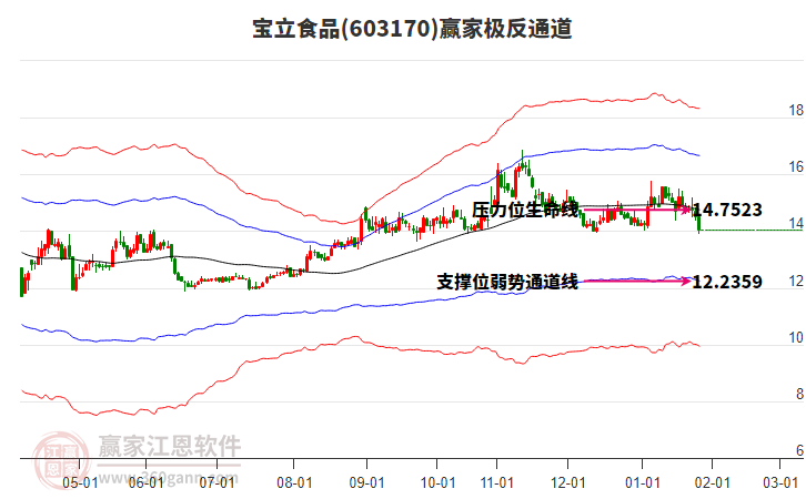 依據(jù)贏家江恩系統(tǒng)趨勢工具極反通道分析判斷寶立食品603170運行在生命線以下弱勢區(qū)域,根據(jù)規(guī)則該股短線輕倉參與,股價跌至弱勢外軌線后波段再結(jié)合其它工具信號建倉。應(yīng)用口訣是:生命線上強勢走,生命線下難抬頭;紅黃兩條外軌線,壓力支撐顯勢頭。