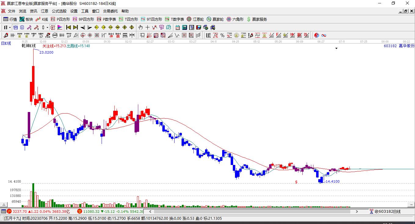 依據(jù)贏家江恩乾坤K線工具展示,本周K線以陰線收盤,目前K線處于紅色區(qū)域,位于關(guān)注線上方,依據(jù)贏家江恩乾坤K線多空模型,目前多頭出局線對當前股價形成支撐,短期看多。后市如若股價跌破多頭出局線,則可能形成短期回調(diào)。