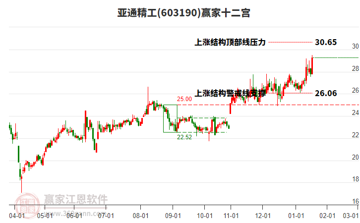今天603190亞通精工最高價26.66上穿了贏家極反通道工具藍(lán)色外軌線,受到藍(lán)色外軌線強(qiáng)力壓制,最終收盤停留在在藍(lán)色外軌線與生命線上方的強(qiáng)勢通道區(qū)域。603190亞通精工近10個交易日漲幅2.09%
