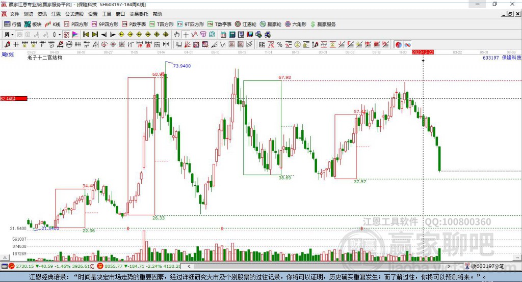 保隆科技處于贏家江恩空頭主線形態(tài),12月17日發(fā)出江恩筑底信號后,經(jīng)過36日,今日形成短期筑頂信號,短期多頭趨勢已被破壞,中期多頭反彈趨勢延續(xù),但長期處于下跌中。保隆科技今日雖高開,截止目前股價低于昨