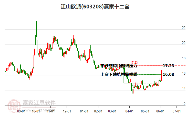 江山歐派(603208)處于贏家江恩多頭主線形態(tài),今日雖重心上移,但短期空頭趨勢未改變,長期發(fā)出江恩筑底信號,屬長期多頭預警。江山歐派今日低開,截止目前微漲1.51%,K線為小陽線,呈上漲走勢。