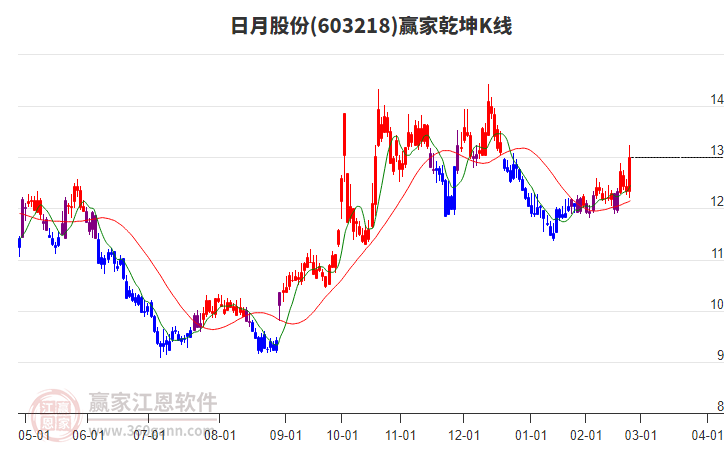 603218日月股份處于贏家江恩多頭主線形態(tài),從12月17日形成底分型后持續(xù)上攻,今日突破前高形成初次江恩筑底信號,中期多頭趨勢延續(xù),但長期處于回調(diào)中。日月股份今日低開,截止目前股價高于昨日收盤價,形