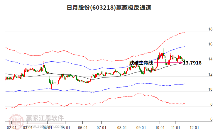 依據(jù)贏家江恩系統(tǒng)趨勢工具極反通道分析判斷日月股份603218運行在生命線以下弱勢區(qū)域,根據(jù)規(guī)則該股短線輕倉參與,股價跌至弱勢外軌線后波段再結(jié)合其它工具信號建倉。應(yīng)用口訣是:生命線上強勢走,生命線下難抬頭;紅黃兩條外軌線,壓力支撐顯勢頭。