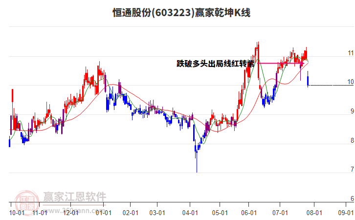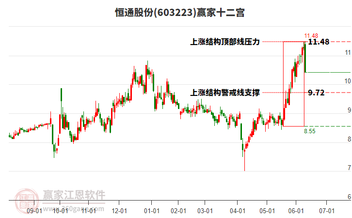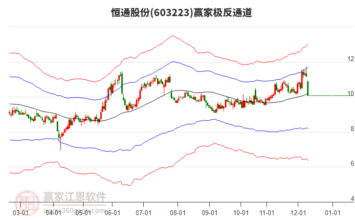 依據(jù)贏家江恩系統(tǒng)趨勢工具極反通道分析判斷恒通股份603223運(yùn)行在生命線以下弱勢區(qū)域,根據(jù)規(guī)則該股短線輕倉參與,股價跌至弱勢外軌線后波段再結(jié)合其它工具信號建倉。應(yīng)用口訣是:生命線上強(qiáng)勢走,生命線下難抬頭;紅黃兩條外軌線,壓力支撐顯勢頭。