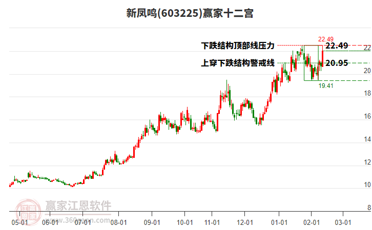 新鳳鳴處于贏家江恩多頭次主線形態(tài),從1月26日形成頂分型后持續(xù)下跌,重心下移,今日跌破前低形成短期初次筑頂信號,短期多頭趨勢已被破壞,中長期多頭趨勢依舊保持。新鳳鳴根據(jù)贏家江恩極反通道趨勢工具展示,上