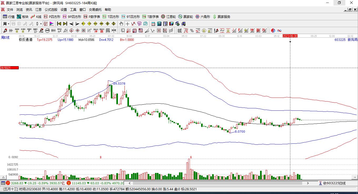 當(dāng)天新鳳鳴最高價21.62挑戰(zhàn)了贏家極反通道工具藍色外軌線,受到藍色外軌線強力壓制,最終收盤停留在在藍色外軌線與生命線上方的強勢通道區(qū)域。新鳳鳴近10個交易日漲幅16.53%。