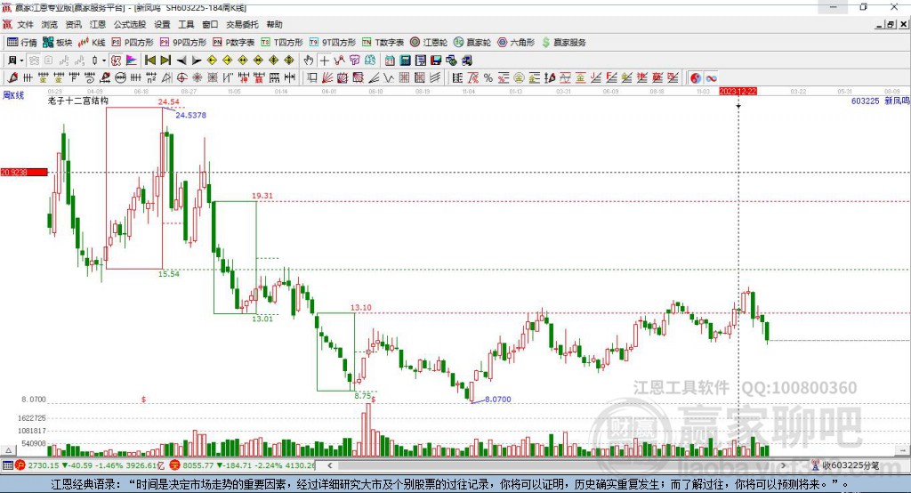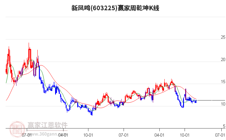 新鳳鳴處于贏家江恩多頭次主線形態(tài),從1月26日形成頂分型后持續(xù)下跌,重心下移,今日跌破前低形成短期初次筑頂信號,短期多頭趨勢已被破壞,中長期多頭趨勢依舊保持。新鳳鳴根據(jù)贏家江恩極反通道趨勢工具展示,上