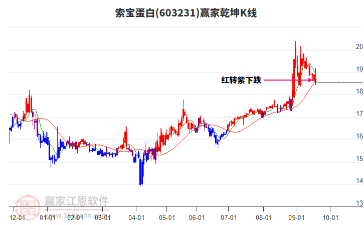 水產(chǎn)品概念進(jìn)入乾坤K線紫色多空爭奪期,贏家工具展示4星降為1星處于空頭區(qū)域