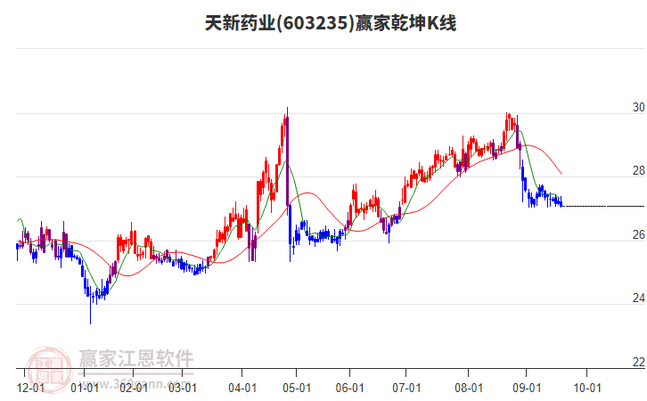 天新藥業(yè)處于贏家江恩空頭中期反彈形態(tài),12月16日發(fā)出江恩筑底信號后,經(jīng)過22日,今日形成短期筑頂信號,短期多頭趨勢已被破壞,中長線均在空頭下跌趨勢中。天新藥業(yè)目前K線為光頭小陰線,且當(dāng)前股價低于昨日