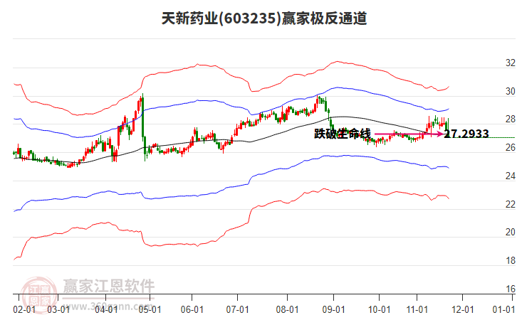 依據(jù)贏家江恩系統(tǒng)趨勢工具極反通道分析判斷天新藥業(yè)603235運行在生命線以下弱勢區(qū)域,根據(jù)規(guī)則該股短線輕倉參與,股價跌至弱勢外軌線后波段再結(jié)合其它工具信號建倉。應(yīng)用口訣是:生命線上強(qiáng)勢走,生命線下難抬頭;紅黃兩條外軌線,壓力支撐顯勢頭。