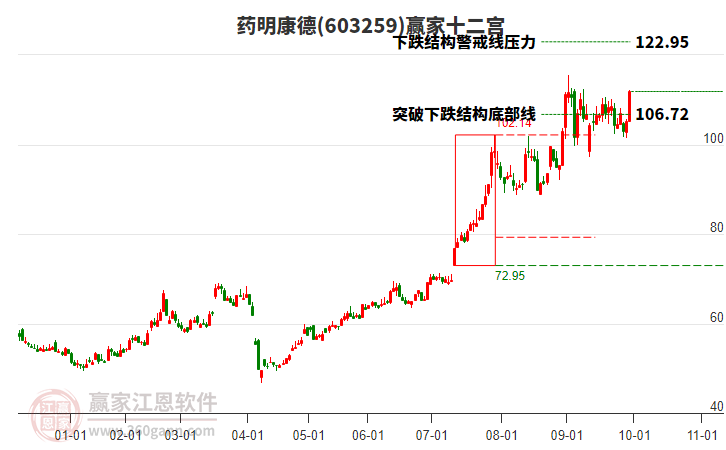 依據(jù)贏家江恩系統(tǒng)趨勢工具極反通道分析判斷藥明康德603259運行在生命線以上強(qiáng)勢區(qū)域,根據(jù)規(guī)則該股可短線、波段結(jié)合操作;結(jié)合物極必反的原理通過分鐘圖做盤中差價,應(yīng)用口訣是:生命線上強(qiáng)勢走,生命線下難抬頭;紅黃兩條外軌線,壓力支撐顯勢頭。