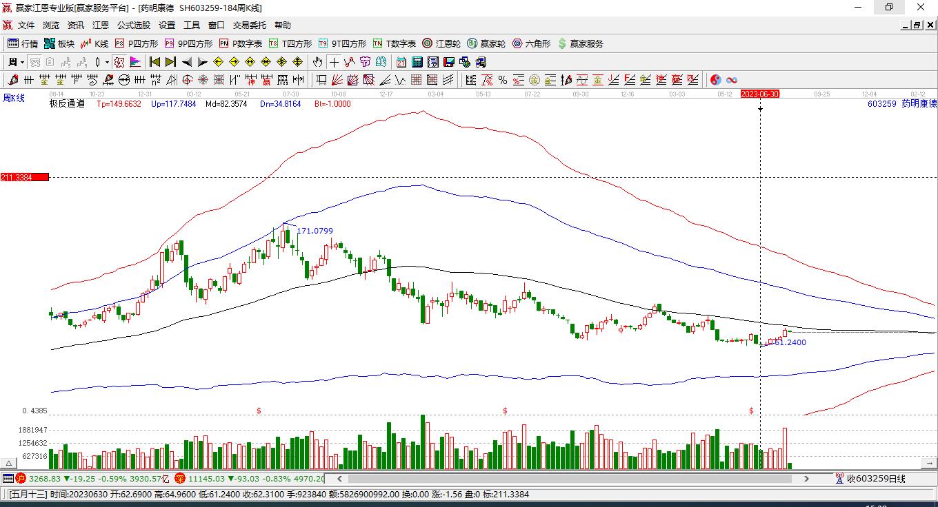 藥明康德處于贏家江恩多頭中期回調(diào)形態(tài),今日重心持續(xù)下移,短期延續(xù)下跌趨勢(shì),6月13日發(fā)出中期江恩筑底信號(hào)后,經(jīng)過(guò)227日,今日形成中期筑頂信號(hào),若持續(xù)下跌,觸發(fā)長(zhǎng)期筑頂信號(hào),藥明康德將轉(zhuǎn)為空頭主線。藥