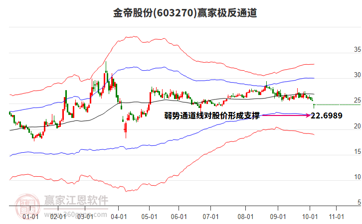 依據(jù)贏家江恩系統(tǒng)趨勢(shì)工具極反通道分析判斷金帝股份603270運(yùn)行在生命線以上強(qiáng)勢(shì)區(qū)域,根據(jù)規(guī)則該股可短線、波段結(jié)合操作;結(jié)合物極必反的原理通過分鐘圖做盤中差價(jià),應(yīng)用口訣是:生命線上強(qiáng)勢(shì)走,生命線下難抬頭;紅黃兩條外軌線,壓力支撐顯勢(shì)頭。