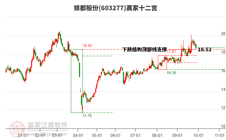 銀都股份處于贏家江恩空頭次主線形態(tài),11月10日發(fā)出江恩筑頂信號(hào)后,經(jīng)過(guò)38日,今日形成江恩筑底信號(hào),短期空頭下跌趨勢(shì)已被破壞,中期多頭反彈趨勢(shì)延續(xù),但長(zhǎng)期處于下跌中。銀都股份截至目前K線為上下影陰線