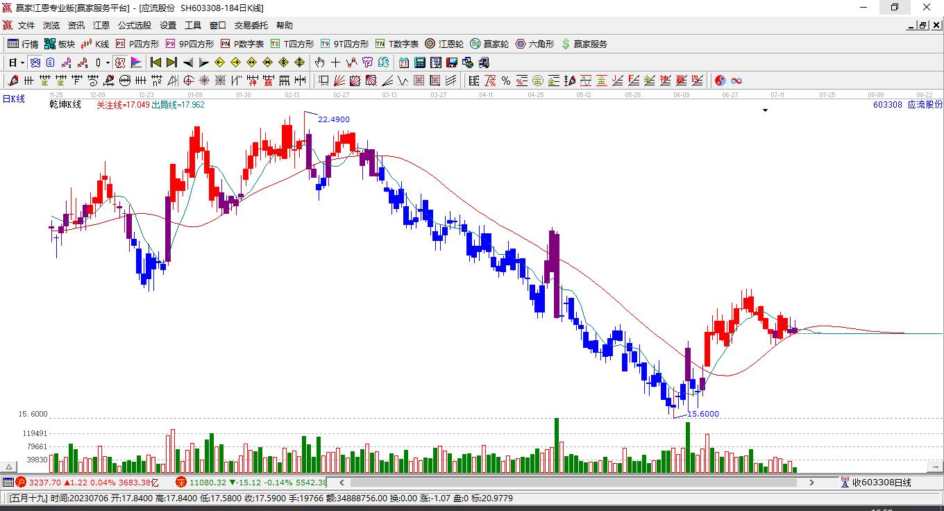 依據(jù)贏家江恩乾坤K線工具展示,本周K線以陽線收盤,目前K線處于紅色區(qū)域,位于關(guān)注線上方,依據(jù)贏家江恩乾坤K線多空模型,目前多頭出局線對(duì)當(dāng)前股價(jià)形成支撐,短期看多。后市如若股價(jià)跌破多頭出局線,則可能形成短期回調(diào)。