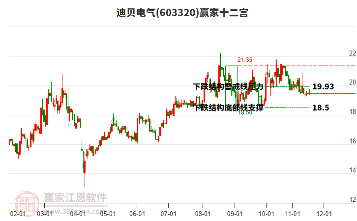 依據(jù)贏家江恩系統(tǒng)趨勢(shì)工具極反通道分析判斷迪貝電氣603320運(yùn)行在生命線以上強(qiáng)勢(shì)區(qū)域,根據(jù)規(guī)則該股可短線、波段結(jié)合操作;結(jié)合物極必反的原理通過分鐘圖做盤中差價(jià),應(yīng)用口訣是:生命線上強(qiáng)勢(shì)走,生命線下難抬頭;紅黃兩條外軌線,壓力支撐顯勢(shì)頭。