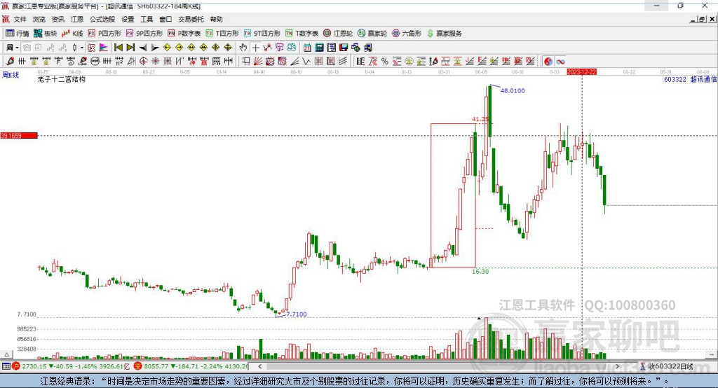 依據(jù)贏家江恩乾坤K線工具展示,本周K線以陽線收盤,目前股價處于藍(lán)色區(qū)域,位于關(guān)注線下方,關(guān)注線對當(dāng)前股價形成壓制,短期看空。后市如若股價有效突破空頭出局線,則有望形成短期反彈(如不能突破空頭出局線,后市將延續(xù)下跌趨勢)。如跌破近期低點,后市將打開下行空間。