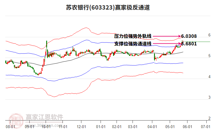 蘇農(nóng)銀行處于贏家江恩多頭中期回調(diào)形態(tài),從2月3日形成底分型后持續(xù)上攻,今日突破前高形成初次江恩筑底信號,中長線均在空頭下跌趨勢中。蘇農(nóng)銀行根據(jù)贏家江恩極反通道趨勢工具展示,上方壓力位5.3621,下方