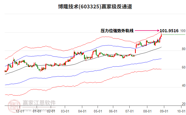 今天博隆技術(shù)最高價91.78上穿了贏家極反通道工具上方紅色外軌線,受到上方紅色外軌線強力壓制,最終收盤停留在在上方紅色外軌線與藍色外軌線上方的超強通道區(qū)域。博隆技術(shù)近10個交易日漲幅14.4%。