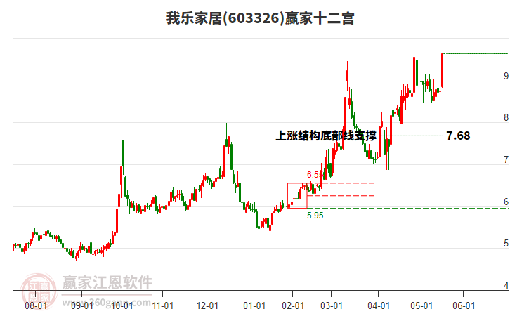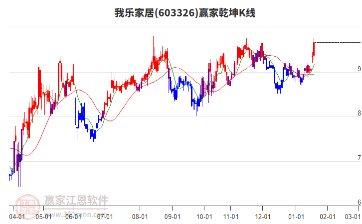 當(dāng)天我樂(lè)家居上穿藍(lán)色外軌線 以中陽(yáng)線收盤(pán)