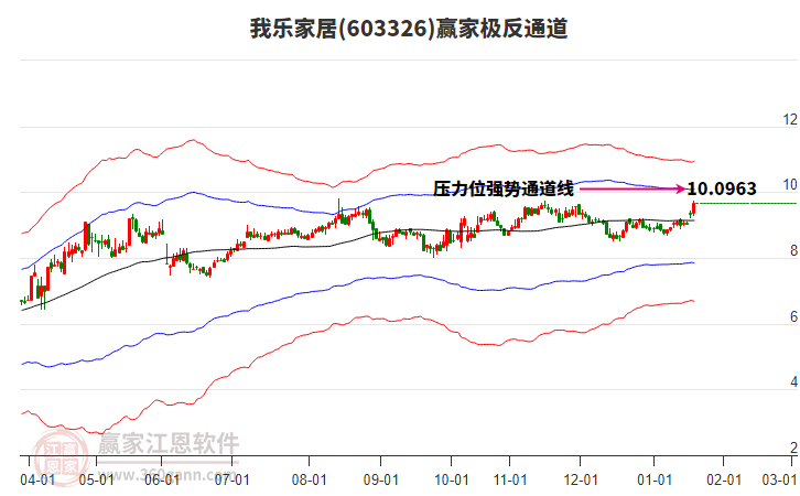 當(dāng)天我樂(lè)家居最高價(jià)10.18上穿了贏家極反通道工具藍(lán)色外軌線,受到藍(lán)色外軌線強(qiáng)力壓制,最終收盤(pán)停留在在藍(lán)色外軌線與生命線上方的強(qiáng)勢(shì)通道區(qū)域。我樂(lè)家居近10個(gè)交易日漲幅13.77%。