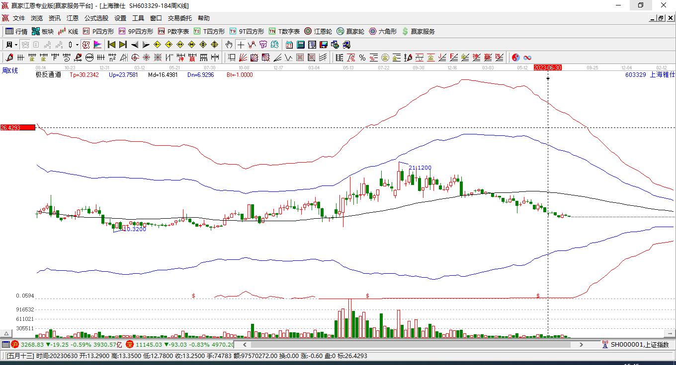 603329上海雅仕處于贏家江恩多頭中期回調(diào)形態(tài),今日重心持續(xù)下移,短期延續(xù)下跌趨勢(shì),從11月14日形成中期頂分型后中期重心持續(xù)下移,今日跌破前低形成初次筑頂信號(hào),長(zhǎng)期處于多頭回調(diào)趨勢(shì)。603329上