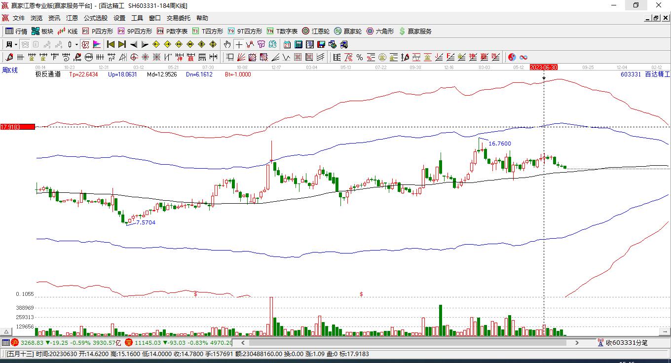 當(dāng)天百達精工最高價19.0挑戰(zhàn)了贏家極反通道工具上方紅色外軌線,受到上方紅色外軌線強力壓制,最終收盤停留在在上方紅色外軌線與藍(lán)色外軌線上方的超強通道區(qū)域。百達精工近10個交易日漲幅10.68%。